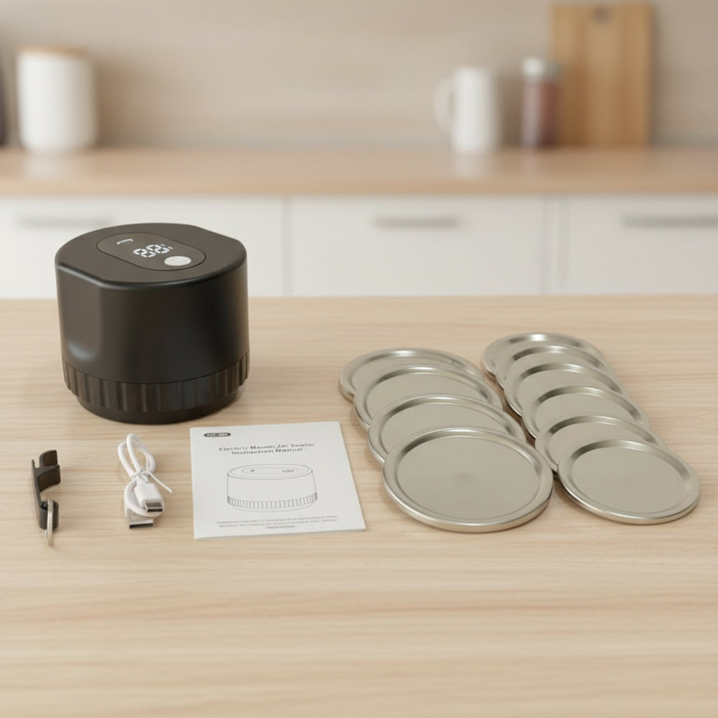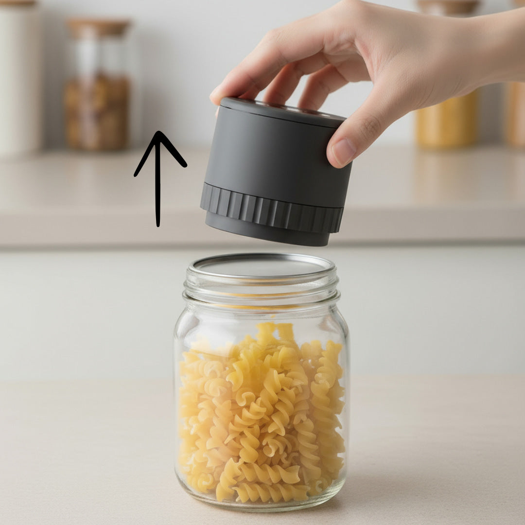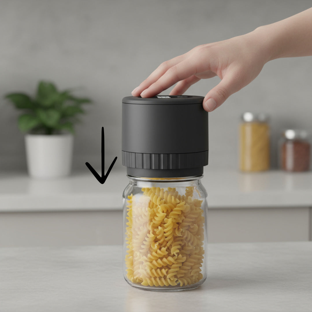 Der Yuvara Lebensmittel Vakuumierer ist die einfache und elegante Lösung, um deine Vorräte länger frisch zu halten. Mit nur einem Knopfdruck versiegelt das Gerät deine Gläser automatisch luftdicht – ganz ohne Pumpen oder Aufwand.